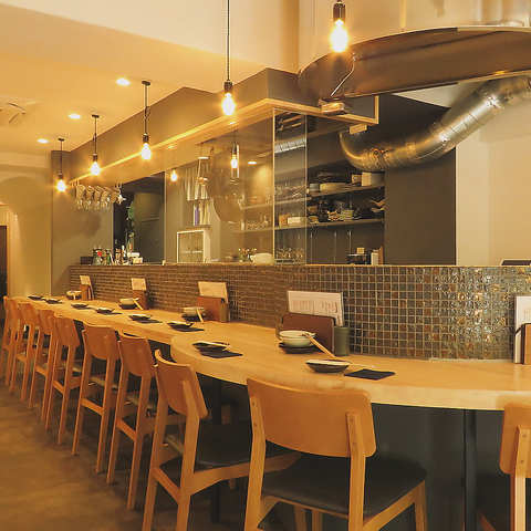 【お一人様から大歓迎♪お洒落なカウンター席】ハイカラモダンな店内です★カウンター席では目の前で焼き上げる臨場感を感じながらお食事をお楽しみいただけます◎入り口付近にはテーブル席もあり、どちらの席からも調理風景がご覧いただけます!目でも見て、味でご堪能ください♪