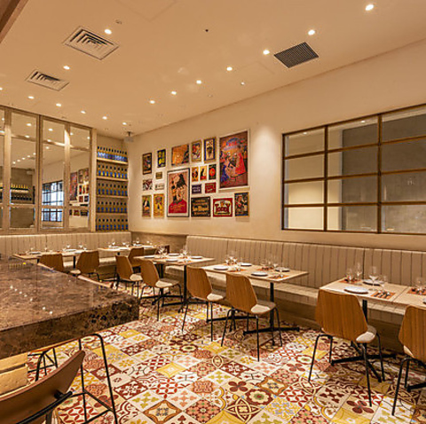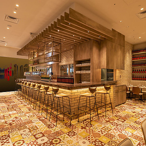 温かみのある木材とモザイクタイルの床が特徴。目の前でシェフが料理を仕上げる様子を楽しみながら、スペイン料理をお楽しみいただけます。居心地の良い雰囲気で、ごゆっくりお過ごしください。