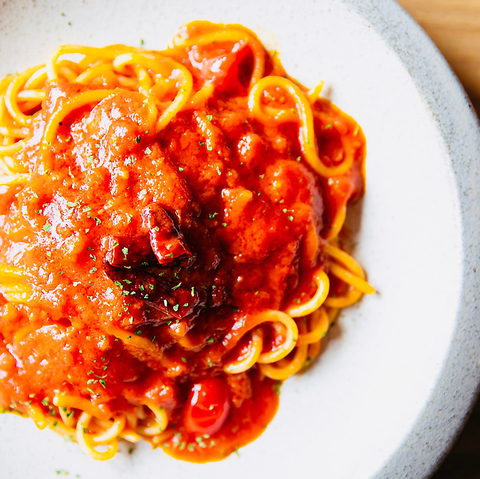 【RED ROOM レッドルーム】では婚礼料理も手掛けるシェフがつくる一品料理がお楽しみいただけます。洗練された店内で召し上がっていただくひと時は、まさに『非日常』。パスタ、ピザ、タパス、パエリア、グリルなどこだわりのスパニッシュイタリアンをご堪能ください。