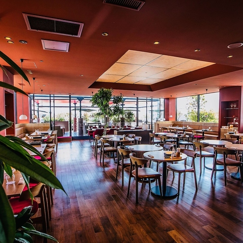 【RED ROOM レッドルーム】の内装は木目調の店内に赤が映える空間となっております。コロナウイルス対策として、席間隔を広くとり広々とお席でお過ごしいただけるようになっております。