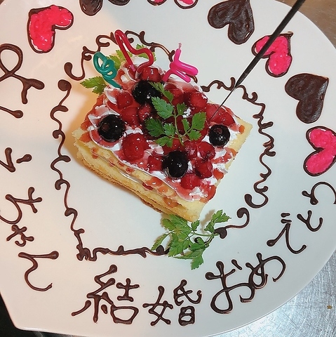 誕生日や記念日での利用も多いため、主役を喜ばせるために、全力サポートいたします!特製メッセージ付きのデザートプレートを+1,980円(税込)でご用意!写真撮影もお気軽にお申し付けください!(メッセージ内容を事前にお申し付けください。)