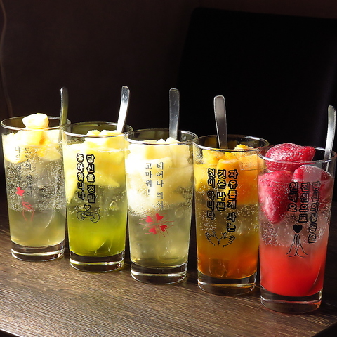 フローズンフルーツがたっぷり入ったフルーツサワーは写真映えすること間違いなし!白桃・イチゴ・マンゴー・パインなど種類も豊富にご用意しております♪その他チャミスルや焼酎、マッコリなどのアルコールを充実しております◎