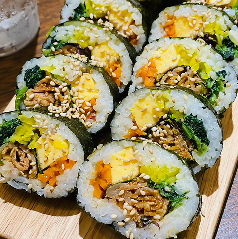 色とりどりの具材を使った手作りキンパを4種類ご用意しております!(牛プルコギのスタミナキンパ、サムギョプサルキンパ、豚カルビのスパイシーキンパ、ツナマヨサラダキンパ)もちろんチーズキンパもお持ち帰りOK!おうちで少し温めてお召し上がりください!