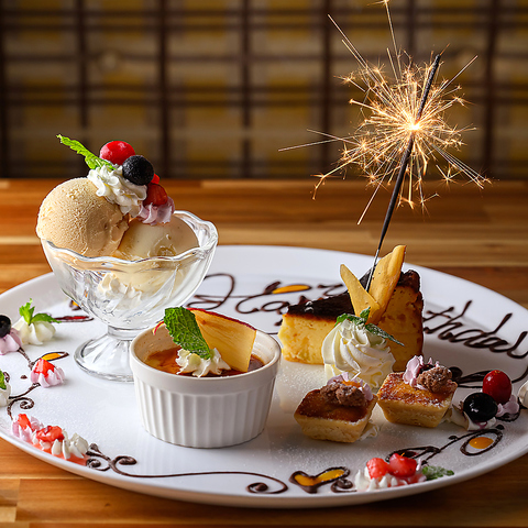 誕生日や記念日のお祝いに利用できる、メッセージ付きデザートプレートをご用意しています。主役の方への想いを言葉に添えた演出ができ、食事の締めくくりに特別感をプラス。デートや女子会で大切なひとときを彩るサプライズとして好評です。事前相談により内容の調整も可能です!