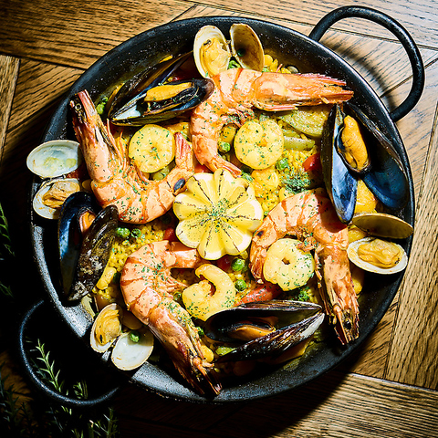 【日比谷エリアのスペイン料理バル】魚介のパエリアは、魚介の旨みを生かしたシンプルな味わいが特徴です。香ばしく仕上げた米の食感とともに、最後まで飽きずに楽しめる構成。ランチやディナーの主役として、ゆったり食事を楽しみたい場面に向いています。