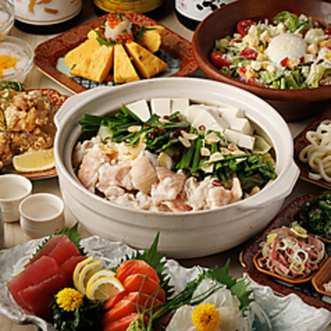 3時間飲み放題付きの宴会コースは2名~OK!少人数貸切大歓迎です!接待、歓迎会、送別会にお勧めです♪宴会コース♪博多ぐるぐる鶏皮串タワーに本日のお造り、当店自慢の博多おでんなど、自慢の逸品料理をご堪能頂けます。和を基調とした落ち着きのある空間で、贅沢なひと時をお過ごしください