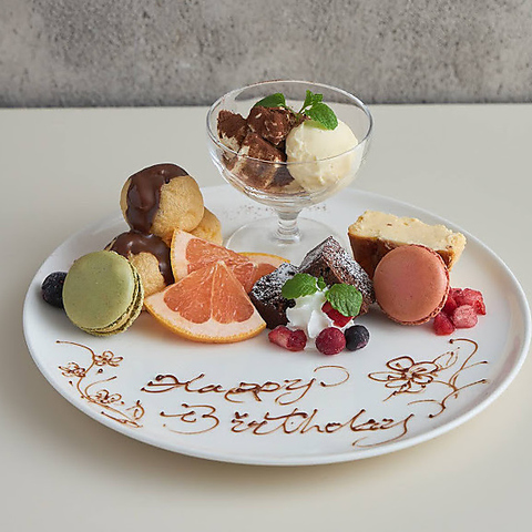 忘れられない記念日・誕生日の演出はお任せください♪デザートプレートはシェフお手製のメッセージ付。1650円でご用意致します☆お電話でメッセージ内容を事前にお伝えください☆サプライズはディプントで♪