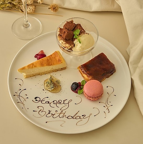 忘れられない記念日・誕生日の演出はお任せください♪デザートプレートはシェフお手製のメッセージ付。1,650円でご用意致します☆お電話でメッセージ内容を事前にお伝えください☆サプライズはディプントで♪