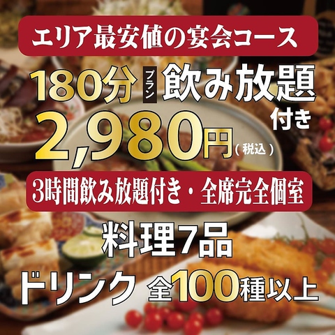 全席個室で3時間飲み放題付きの宴会コースが2980円(税込)~ご案内可能!