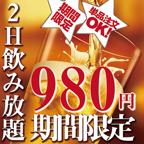 2時間飲み放題が驚きの980円!個室でご案内します。