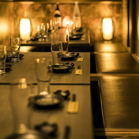 団体様のご利用にも最適です。洗練された空間は、優しく灯る間接照明が印象的な個室席です。個室席のご予約はお早めに!人数に合わせたお席をご提案させていただきます。