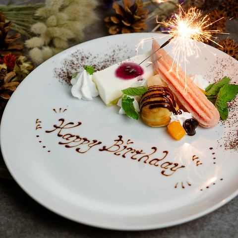 特別な記念日や誕生日にぴったりの華やかなデザートプレートをご用意しております。見た目にも美しい仕上がりに。メッセージも添えられるため、大切な人への想いを形にできる一皿です。多くのお客様からご好評いただいております。心に残るひとときを演出するために、ぜひご利用ください。
