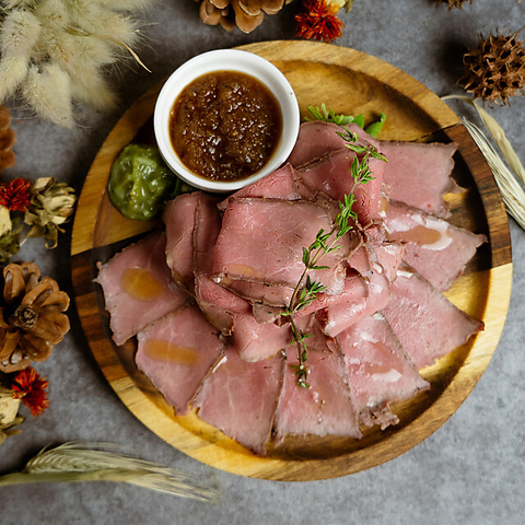 厳選した牛もも肉を低温でじっくり火入れし、肉汁を閉じ込めた自家製ローストビーフ。赤身ならではのしっとりとした食感と濃厚な旨味が特徴です。自家製ソースが肉の風味を引き立て、噛むほどに深い味わいが広がります。前菜にもメインにも使える万能な一皿で、ワインやビールとの相性も抜群です。