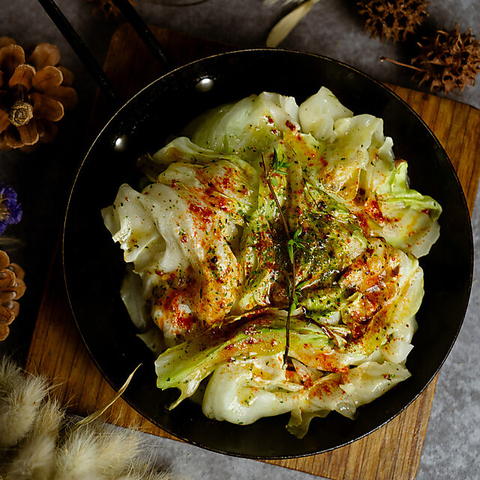 熱々の鉄板で香ばしく焼き上げたキャベツに、コク深いアンチョビソースを絡めた一品。シンプルながら旨味たっぷりで、ビールやワインのおつまみにぴったりです。
