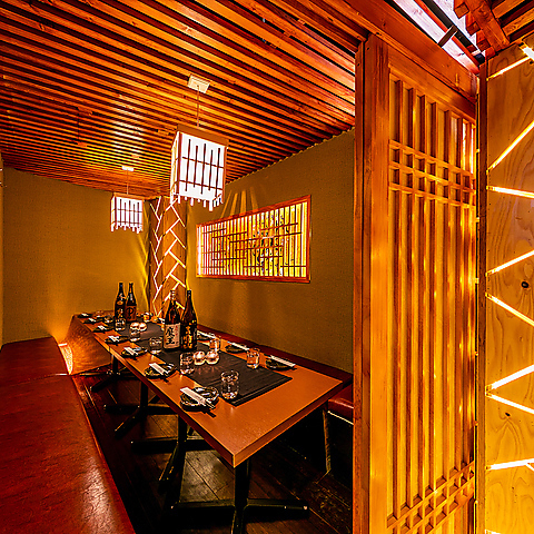 間接照明と和の装飾の数々が洗練された大人な落ち着いた空間を演出しております!扉付きとなっておりますので周りを気にせずお楽しみいただけますよ!当店でゆっくりと羽を伸ばしてご寛ぎくださいませ♪(川崎 個室 肉寿司 肉炙り寿司 焼き鳥 串焼き 居酒屋 飲み放題 日本酒 貸切 接待 宴会 女子会 誕生日 記念日)