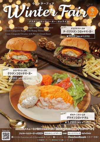 ・冬だけの贅沢。ひとくちで広がる濃厚グラタンの幸せ。・とろける旨さで心まであったまる“冬限定バーガー&オムライス”。・熱々クリーミー。冬のご褒美グルメ、解禁。・濃厚ソースが主役!冬の味覚をたっぷり堪能できる限定フェア。