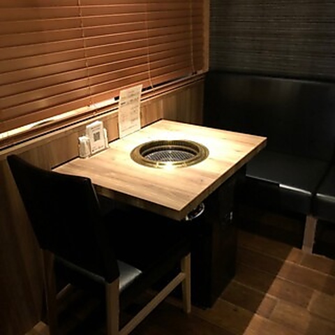 シンプルでおしゃれなデザインが特徴で、4人での利用に最適です。各テーブルに焼肉グリルがあり、自分たちで焼いた料理を楽しむことができます。