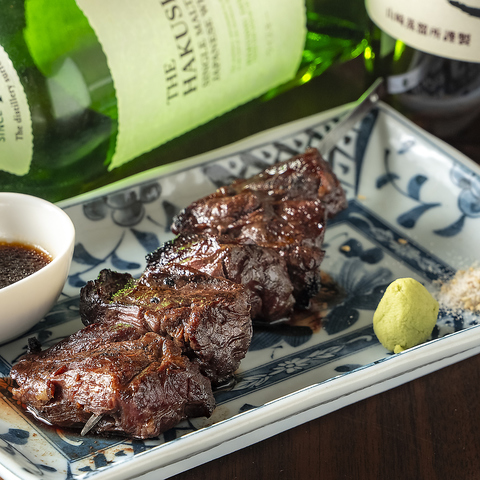 一本が大きく食べ応え抜群の牛さがり串。自家製ジャポネソースの香ばしさに、ごま塩やわさびを添えて、味の変化も楽しめます。肉の旨みを引き立てる贅沢な一本です。