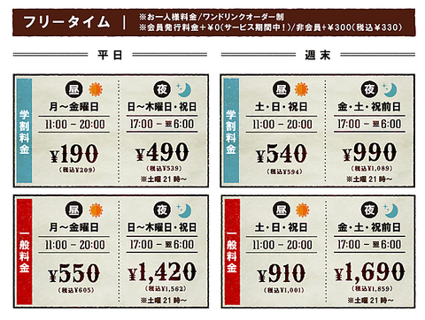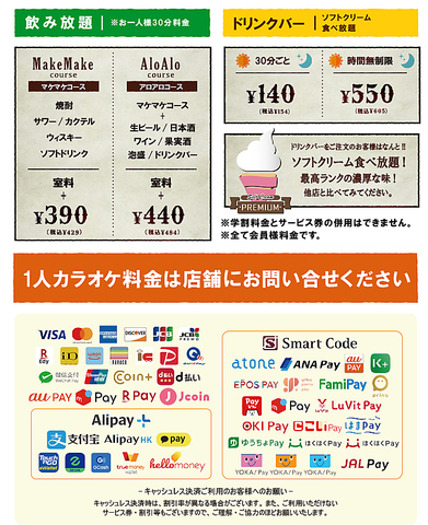 | ソファー | 14名様×1 | ~18名様までの大部屋もご用意!忘新年会、追いコン新歓、歓送迎会も!もちろんヒトカラ、デート、合コンにも◎ |