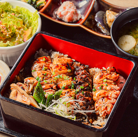 四種類の焼き鳥を自慢のタレに絡めて、ご飯の上に!一気に頬張れば幸せが広がります!新提案の重箱スタイル