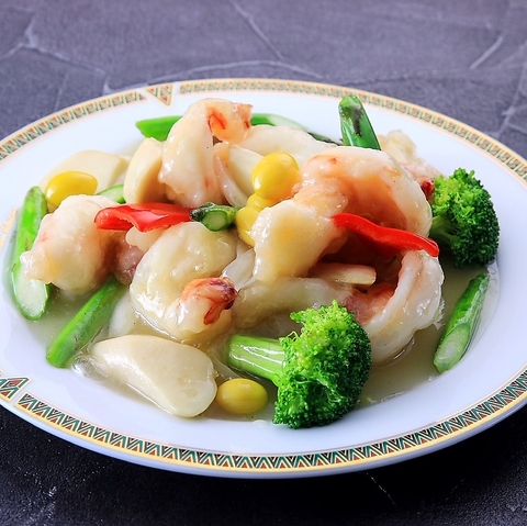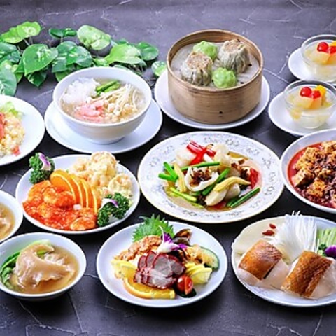 前菜からデザートまで楽しめる8品入りフルコースがなんと2950円。人気の冷菜2品+おすすめの炒め料理3品+チャーハン+揚げ物+デザートでボリュームたっぷり。他に点心や海鮮も楽しめる8品入りコースがなんと3300円。(写真は3300円コースです)