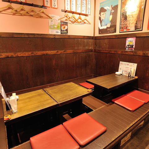 赤いシートが印象的なテーブル席です。4名様掛けのテーブルが2卓ございます。仕事帰りの飲み会や接待などにご利用ください。