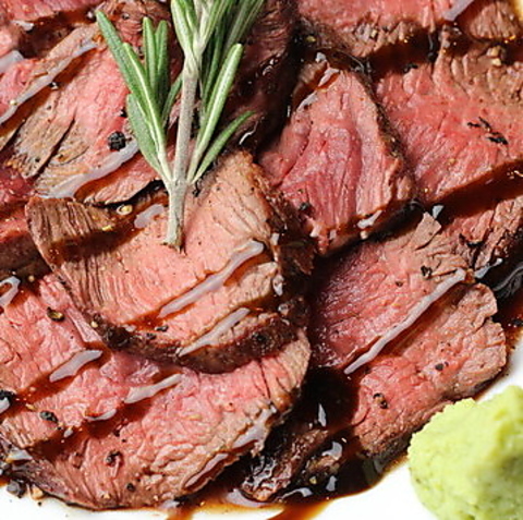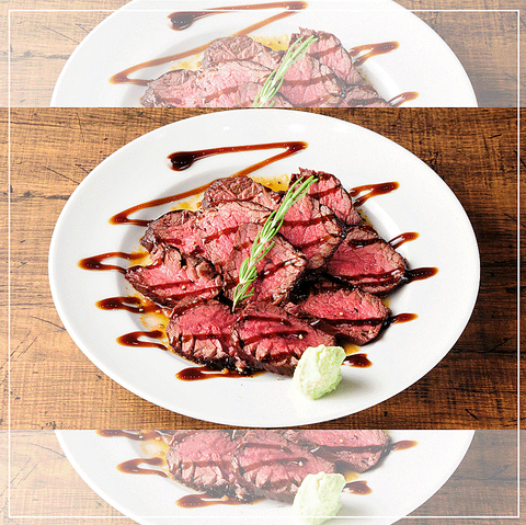 たっぷり150グラム使ったブラックアンガス牛のお肉を炭火でじっくり焼いた一品。2種類のソースにわさびのアクセントでいろんな味に変化させて楽しめる不動の人気No.1メニュー!自家製オニオンガーリッックソースが味の決め手!