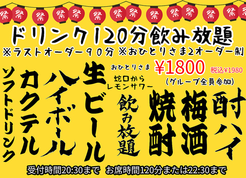 受付時間日月火木祝日当日17:00~20:00※蛇口レモンサワー&ソフトドリンク 生ビール/ハイボール/サワー各種/焼酎/梅酒も全て飲み放題!※飲み放題は90分/お席の時間が120分になります。