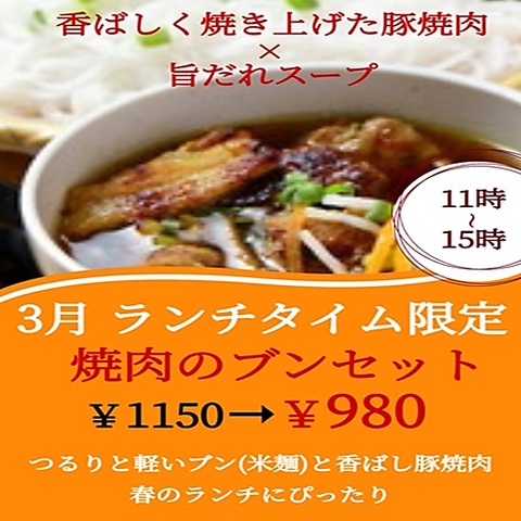 ランチタイム限定で焼肉のブンセットが¥980円香ばしく焼き上げたお肉の旨みと、つるっと軽いブン(米麺)が相性抜群◎具材を混ぜるほど味が変化し、食べ進めるたびに違う表情が楽しめる!この機会に、焼肉ブンセットをお得にどうぞ♪ハズレなしのくじ引きも有◎