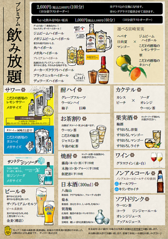 グラスドライ、ハイボール、芋焼酎【霧島・木挽・飫肥杉(水割・お湯割・炭酸)】、ソフトドリンク、のんアルコール)