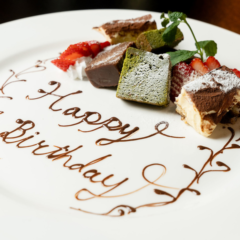 当店は1000円(税込)にて、記念日のお祝いメッセージをお作りします。大切な方の誕生日や記念日を特別な料理と共にお祝いできるよう心を込めたサプライズをご提供します。デザートプレートに美しいメッセージをお書きし、思い出に残る一瞬を演出し、素敵なひとときをお手伝いします♪コース欄からプレートを選択しご予約下さい。