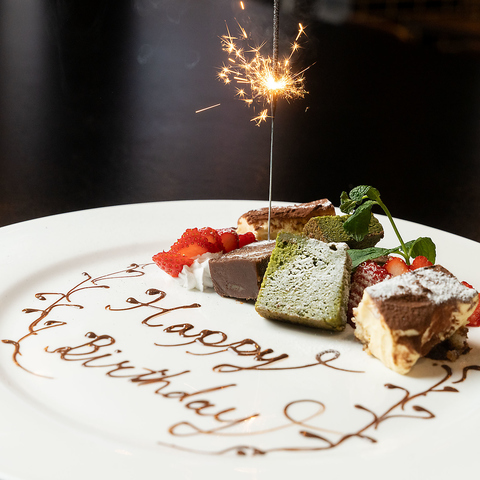 当店は1000円(税込)にて、記念日のお祝いメッセージをお作りします。大切な方の誕生日や記念日を特別な料理と共にお祝いできるよう心を込めたサプライズをご提供します。デザートプレートに美しいメッセージをお書きし、思い出に残る一瞬を演出し、素敵なひとときをお手伝いします♪コース欄からプレートを選択しご予約下さい。