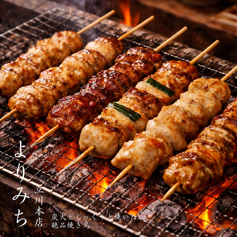よりみち自慢の焼鳥は厳選した新鮮な地鶏を使い、料理長自らその日の毎朝丁寧に串打ちしております。脂肪が少なく、キュッと締まった肉質の地鶏は、適度な弾力と口の中いっぱいに溢れ出す肉汁の旨味に虜になるお客様が続出しています♪当店自慢の焼き鳥は飲み放題付き宴会コースでもお楽しみいただけます◎