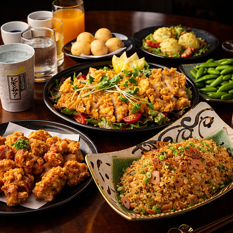 コスパ自慢のお得な食べ飲み放題コースが新登場!!定番のおつまみメニューやサラダはもちろんのこと、大人気メニュー『ニラ玉子』や『棒棒鶏』などといった逸品中華メニューなど種類豊富なフードメニューとドリンクメニュー合わせて90種以上が2時間食べ飲み放題♪超破格!!予約必須のプランなのでご予約はお忘れなく!!