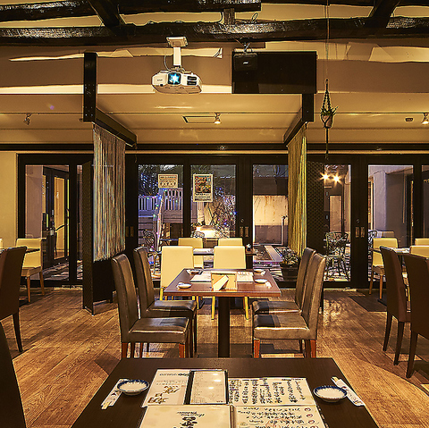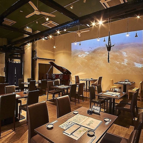 店内は広々スペースとなっておりますのでごゆっくりお食事ができるような空間となっております。しっかりと清潔な空間を保つようにしており、大きなスクリーンなどもございますのでパーティやイベントでも盛り上がるような演出も可能です。
