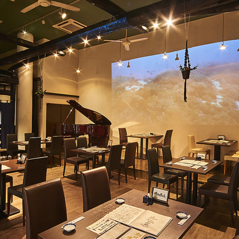 和モダンかつ広々としたメインフロアは、間隔にゆとりを持たせてテーブルを配置。メインフロア最大50名様までの着席可能かつプロジェクターもございますので、歓送迎会や送別会、各種パーティーにもどうぞ。