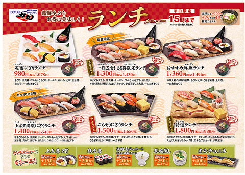 平日11~15時限定!!【1】冬の旬盛りランチ1430円(込)【2】定番にぎりランチ1078円(込)【3】おすすめ鮮魚ランチ1496円(込)【4】ごちそうにぎりランチ1650円(込)【5】一日五食!まる得限定ランチ1430円(込)【6】上ネタ満腹握りランチ1540円(込)【7】特選ランチ1980円(込)