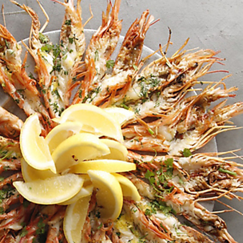 名物!赤海老12尾 「エビの太陽」とラテン音楽流れる空間と陽気な現地スタッフのお出迎えで、スペイン小旅行気分♪本場仕込みのスペイン料理と日本人テイストに合わせたオリジナル料理の数々。