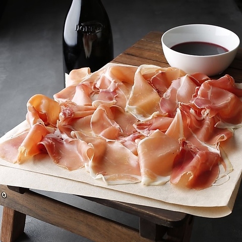 名物各部位の生ハム、ここまで部位を揃えているのは当店ならでは!美発泡酒ランブルスコと 相性抜群!600円から承ります。