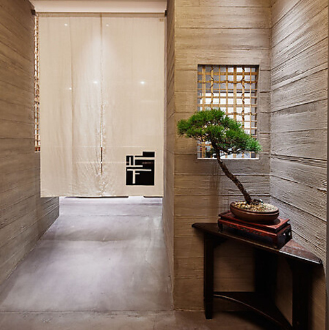静かに迎えてくれるのは、凛とした松の盆栽と上質な暖簾。和の美意識が息づく、特別な時間の始まりを予感させます。