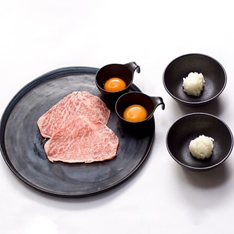55の看板メニュー!3秒炙り焼きしたら卵黄に絡めてひとくちご飯と一緒にお召し上がりください。ご希望の方はスタッフが絶妙の焼き加減でお焼きします。一人前:大判薄切り1枚(卵黄ひとくちご飯付き) ※写真は2人前です