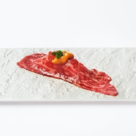 焼肉はもちろんサイドメニューのお料理も全て一品一品美しく仕上げてご提供いたします。強火でサッと炙った香ばしい特選肉の上には贅沢に散りばめられた宝石のように輝くウニといくらがたっぷり。お肉の味わいを引き立てるさっぱりとした酢飯と特製の詰めダレも欠かせません。思い切って一口でお召し上がりいただくと、そこには最高の幸せが…。