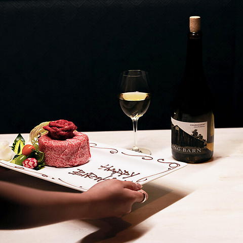 大切なお誕生日・記念日などのお祝いに『特製肉ケーキプレート』『デザートプレート』のご予約を承っております。お名前やメッセージなどを事前にお知らせいただければ、プレートにデコレーションしてご提供いたします。音楽や照明演出もございますのでお気軽にご相談下さい。※肉ケーキプレートSサイズ4,000円~、デザートプレート1,500円