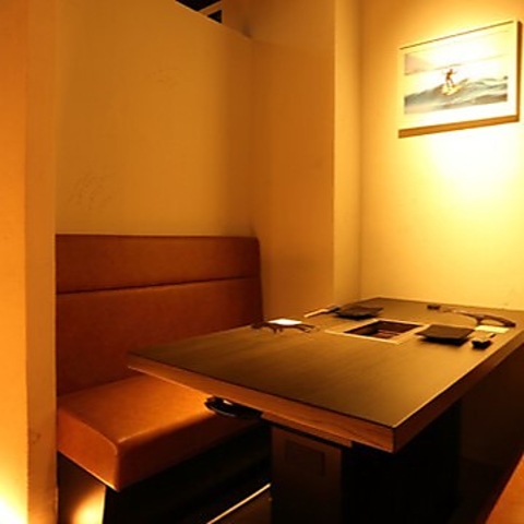 【半個室はカジュアルなデートにおすすめ】壁とパーテーションで区切られた半個室席をご用意しております。周りを気にせず、お二人だけの空間でゆっくりとお食事をお楽しみいただけます。両サイドがベンチシートなので、ゆったりと寛いで座れるのも魅力。デートや大切な方との接待にも最適な、落ち着いた雰囲気の空間です。