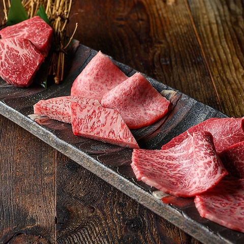 厳選部位の赤身や特選の中よりその日のおすすめ5種をおまかせ盛りにて。初めてのご利用のお客様に大人気&オススメ!(2人前:3種各2カット)