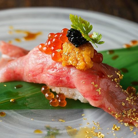 その日ごとにお寿司に最適な赤身部位をセレクト。薄くカットして炙り焼きして握ります。ウニといくらも添えられた贅沢な一貫。