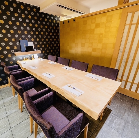 店内には”金の個室”や完全個室を配備◎特別な日にもぜひ。お洒落で落ち着いた雰囲気の店内には、金の個室をご用意しており、お顔合わせや接待などのシーンにも最適です。また、半個室や8名までの完全個室などもございますので、人数に合わせてご利用ください。そのほか、カウンター席などもあり、おひとり様でもお気軽◎