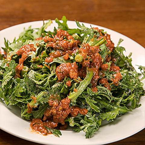 新鮮な春菊とパクチーを贅沢に使用した、香り豊かな人気サラダです◎味の決め手は、素材の良さを引き立てるこだわりの自家製胡麻ドレッシング♪パクチー抜きも承りますので、苦手な方も安心してお楽しみいただける当店自慢の逸品です♪お肉料理との相性も良く、お口直しにもぴったり◎独特の香りとシャキシャキした食感が癖になる一皿♪