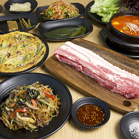 * 熟成サムギョプサル* 付け合わせ5品* チゲ(海鮮スンドゥブ、キムチチゲ、味噌チゲ)の中1品* トッポギ(チーズトッポギ、海鮮チーズトッポギ)の中1品 or チヂミ(チーズキムチチヂミ、海鮮ネギチヂミ)の中1品* チャプチェ* ご飯(+242円/名でおにぎりに変更可能)* ドリンクバー※2名様から注文可能