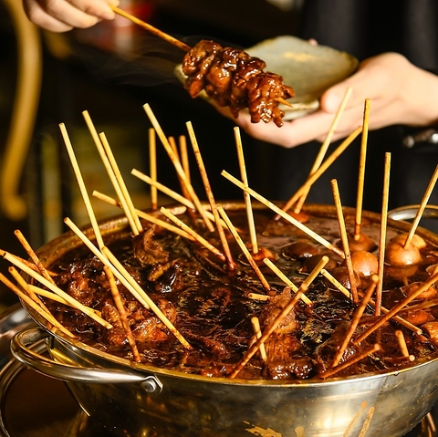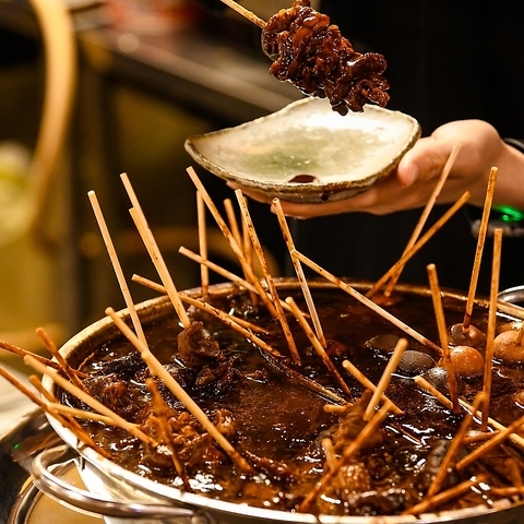 鍋いっぱいに刺した牛すじのどてやき♪八丁味噌をふんだんに使いとこちゃんオリジナルの味に仕上げました!うますぎてほっぺが落ちることまちがいなし!!